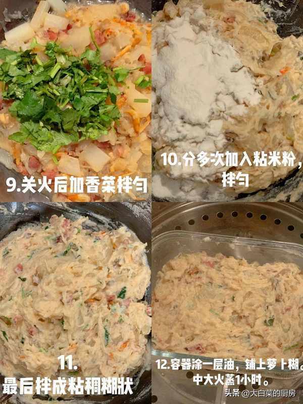 5.有些朋友怕蒸出来不成型,成型的关键是!粘米粉不需要先用水调开,直接干粉往蒸出水的萝卜里加,加一点后拌匀,加一点后拌匀,重复至拌到一个很粘稠的状态,干一点没关系,太湿蒸出来才会不成型