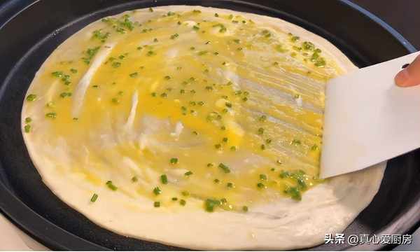 小碗中打入三颗鸡蛋,加一把小葱,搅拌均匀备用。面剂醒好后直接擀成一张大圆饼,擀的越薄越好,电饼铛油热后,下入饼皮,淋入适量蛋液,涂抹均匀后盖上盖子,大火烙至面饼定型