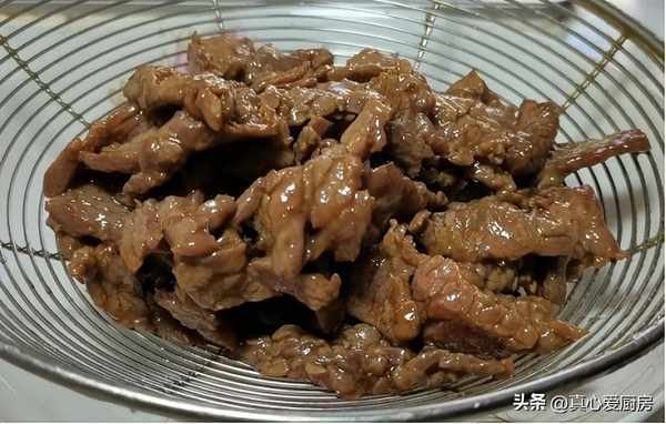 锅中油热后,先把牛肉下锅,快速的将牛肉滑散,牛肉炒到变色后控油备用