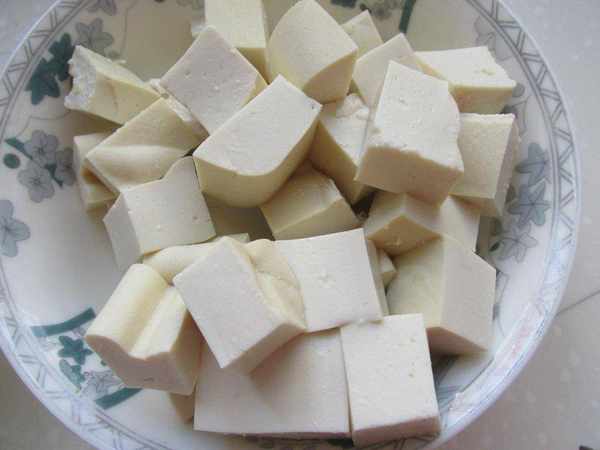 把豆腐均匀切成小块,将锅内倒水,等到水烧开,把豆腐过水三分钟,这样不容易碎,然后捞出来备用