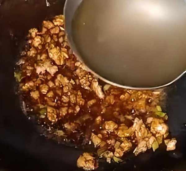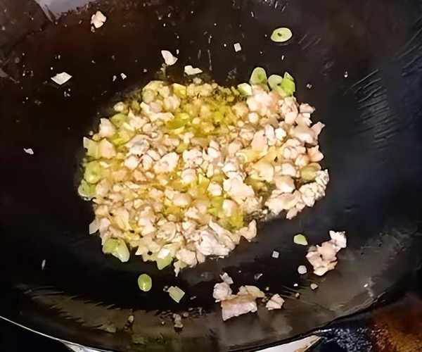 倒入肉沫,把肉沫炒散炒香,炒变色,肉沫可以自己切,可以用绞肉机打,也可以在市场或超市买打好的肉沫