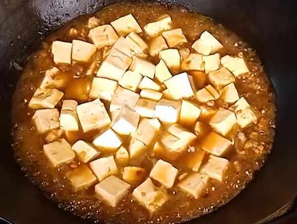 倒入高汤,没有高汤用纯净水,漫过肉末,烧开,倒入豆腐,简单翻几下