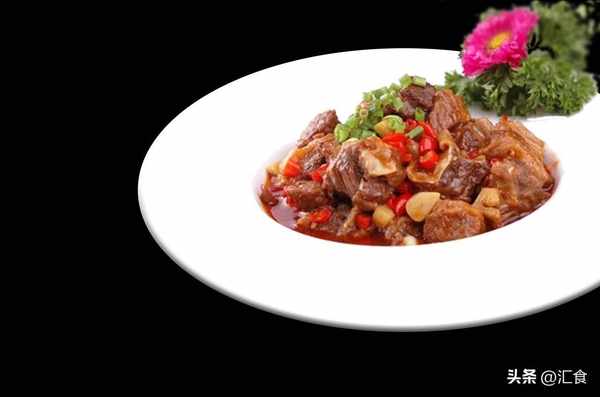 加入香料炒香,放入没过食材的高汤或者水,调味后大火烧开,转小火盖上盖子把牛肉煨制成熟,汁水收干后出锅摆盘,撒入适量的葱花和小米椒点缀即可。