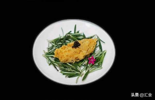 把做好的面擀薄裹上紫米条,放入油锅中炸至成熟,捞出控油后摆盘,用鱼子酱点缀即可。