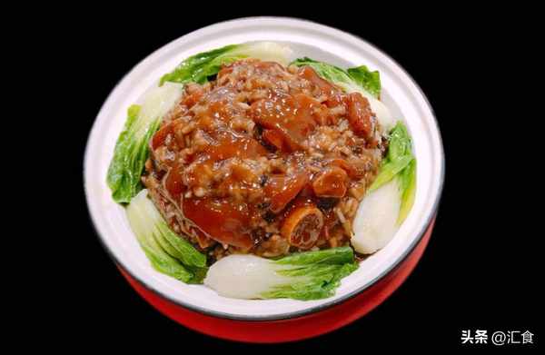 把压好的猪手倒入锅中,大火收汁至汤汁浓稠,把猪手依次放入碗底,加入蒸好的米压紧实,扣在盘中淋上卤汁摆好焯水后的菜心即可。