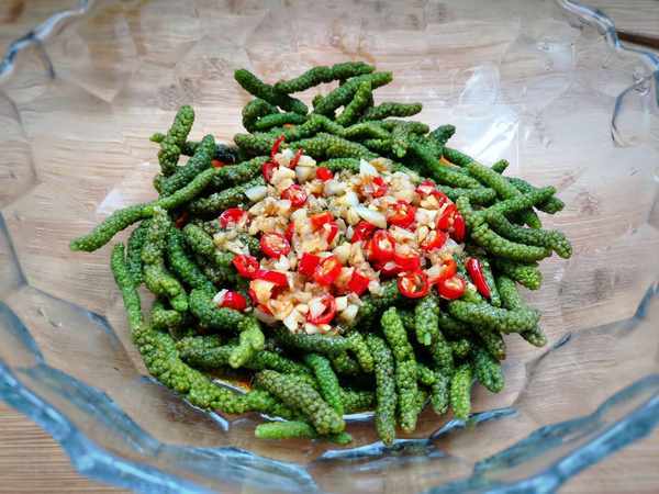 食材:构树穗1盘、小米椒3根、蒜2粒、2生抽、少许食盐、白糖、鸡精粉、2勺香醋。