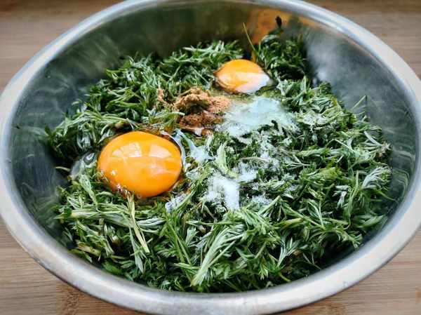 2、白蒿捞出攥干水,不用太干,切成小段,不要切太碎,影响口感,放入盆子里面,把2个鸡蛋打入,加一小勺盐,半勺五香粉,充分搅拌均匀。