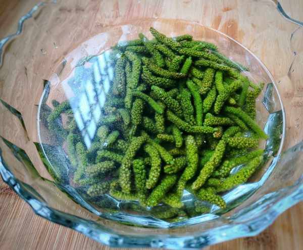 2、把枸树穗用盐水泡十分钟后,洗净,锅中加水烧开,将构树穗焯水2分钟,捞出后冷水冲一下,沥干水分备用。