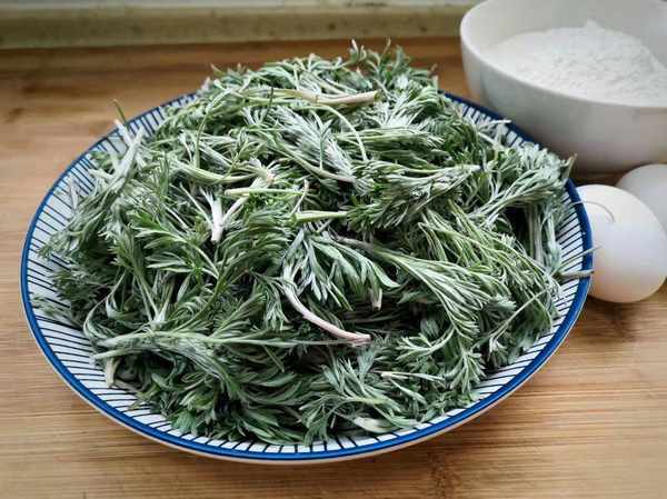 1、我准备一大盘白蒿择干净,每棵白蒿都要处理干净,摘除根部,黄叶,杂草,还有一碗面粉,2个鸡蛋,盆里加入适量的食盐加水搅动融化,把白蒿倒进来浸泡半个小时,用流动的清水多冲洗几遍,处理干净,