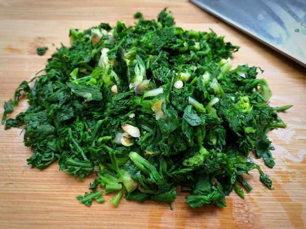 2、捞出过一遍凉水,保持荠菜的翠绿爽口,捞出用手挤压出水分,切成小段。