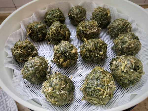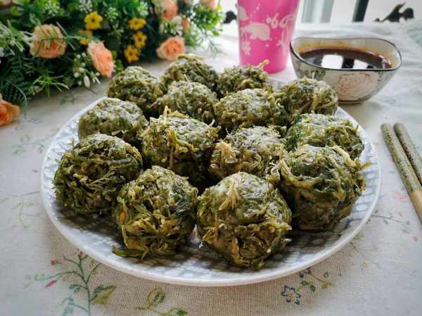 3、分次加入适量面粉,加入面粉的量没有比例,白蒿蒸出来比较干,可以给它加点水拌得湿一点,能用手团成团子就好了,接下来就用手一个一个地团成小菜团,菜团大小根据家人喜好随意就好。