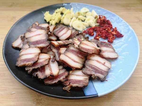 2、1块腊肉冲洗后切成薄片,大蒜切成蒜片,辣椒切成小段,生姜切成姜末,热锅冷油,加入腊肉翻炒煸出多余的肥油,炒至腊肉表面变金黄时,加入干红辣椒、蒜片,姜末和瘦肉一起翻炒一会。