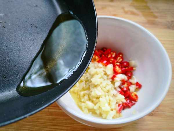 3、把蒜末,小米椒段放入碗中,热油浇入,激出香味,加2生抽,少许食盐,白糖,鸡精粉,2勺香醋搅拌均匀。