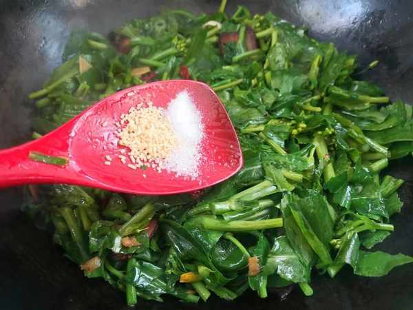 3、先下入菜杆,大火翻炒到菜杆变软之后,马上加入菜叶翻炒均匀,加少许盐,鸡精,白糖,生抽调味,腊肉已经是有盐度的了,喜欢清淡一点的朋友就可以不用再加盐了。