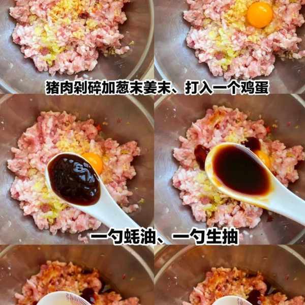 提前准备一些热开水(稍后炖丸子用)将马蹄去皮切碎,姜随意切碎备用。猪肉馅中加入鸡蛋、盐、糖、胡椒粉、淀粉、生抽、料酒,用筷子顺着同一方向划圈搅拌,直到肉馅产生黏性。一定要沿着同一方向划圈搅拌,才能让肉馅更快上劲,中途不要改变方向。