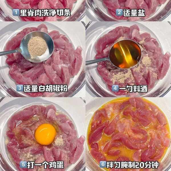 将所有腌制用料倒在肉条上面,抓匀,腌制20分钟。