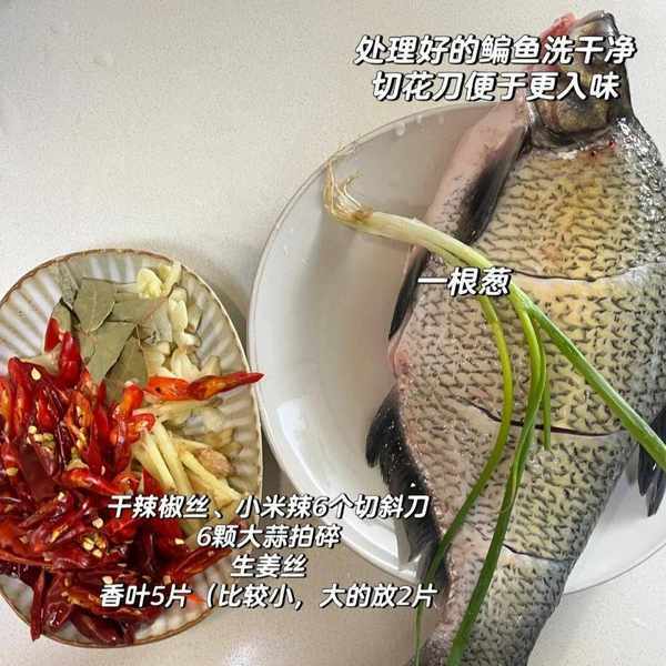 鳊鱼、6颗大蒜、15个干辣椒切丝、6颗小米辣