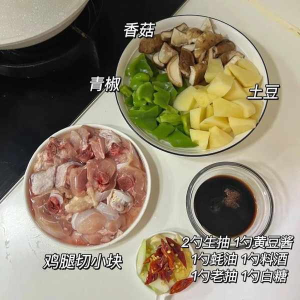 香菇 青椒 土豆 2勺生抽 1勺黄豆酱 鸡腿切小块 1蚝油 1勺料酒 1勺老抽 1勺白糖 葱姜蒜干辣椒
