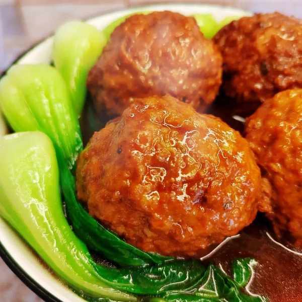 在盘中摆入炖好的丸子,然后淋上适量的料汁,马上享用吧。