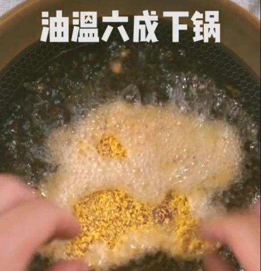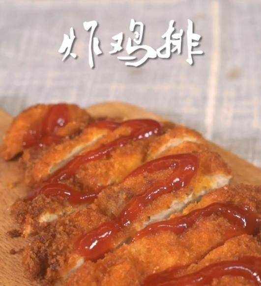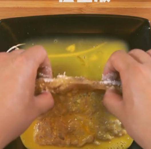 撒上黑胡椒粉、盐和料酒,腌制30分钟。和炸鸡排一样的工艺,裹上淀粉、蛋液和面包糠,油温60%热时下锅炸,炸至金黄酥脆。