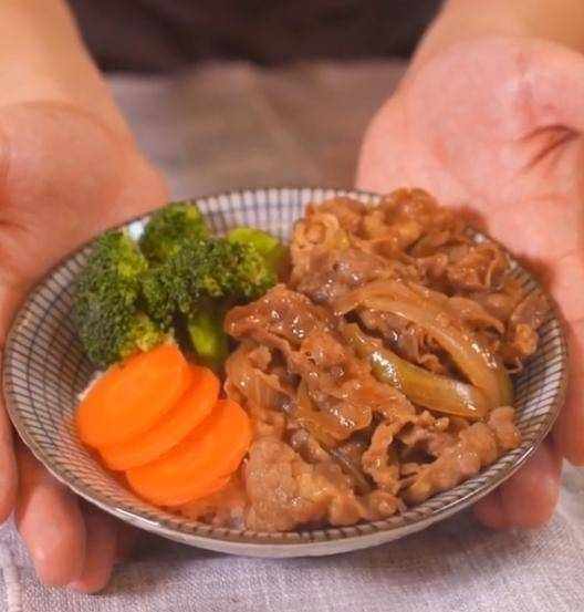 把肥牛肉放在又白又肥的米饭上,配上自己喜欢的蔬菜(牙齿不好的人可以一边煮肥牛肉一边煮蔬菜),最后把锅里剩下的汤倒进去,开始煮吃!