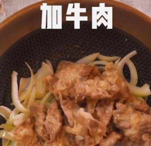 锅里少油,爆香洋葱丝,加入焯过的牛肉