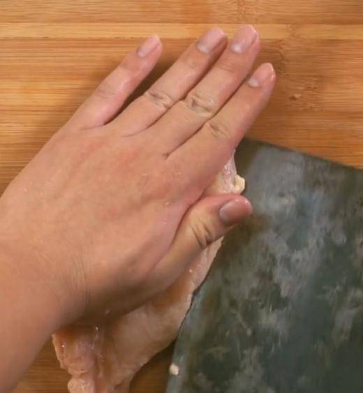 鸡胸肉洗净,切掉边缘的黄色脂肪,从中间最厚的部分切掉,注意不要切到手。