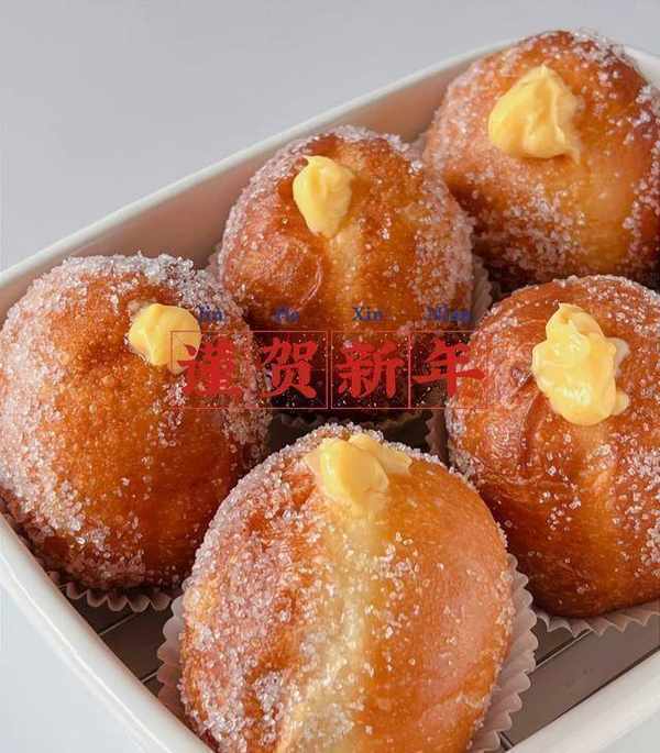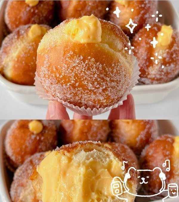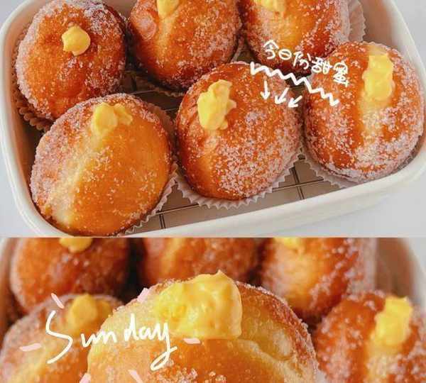 姐妹们好,心心念念已久的蛋奶甜甜圈,今天也算是安排好了,外皮酥脆,面包松软,还有一个满嘴的蛋奶沙司。我真的很喜欢这个味道,喜欢的话就赶紧学起来吧。#自制高颜值甜品#