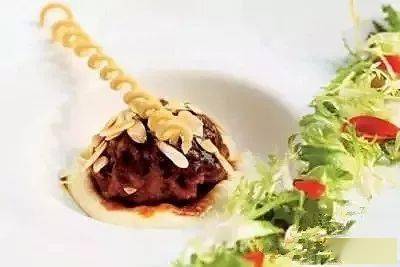 创意灵感来自于欧洲非常著名的瑞典肉圆这道菜,用中餐红烧狮子头的做法,搭配西式的配菜和装盘。