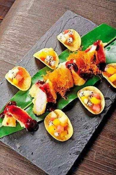 这是一道典型的中菜西做的融合菜,用中餐“包”的技法,将虾胶包在腐皮之中,炸至外酥里嫩,配以薯片沙拉,此菜老少皆宜,色泽艳丽。
