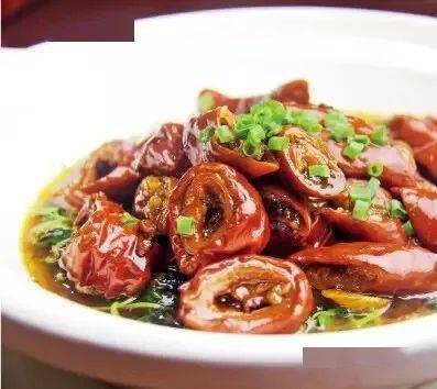 1.肥肠800克用白醋和面粉各50克反复搓揉,清洗后放入冷水锅内,加入葱段、料酒、姜片各20克,八角2颗,香叶3片,大火烧开,改小火煮至断生,捞出肥肠,切成长2.5厘米的段。