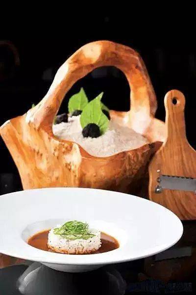 我用精心挑选的根雕篮盛装稻花香米与黑松露块,黑白对比鲜明,不仅成菜大气、美观,而且使客人了解到制作菜品的食材来源,通过厨师现场讲解与用专用黑松露刨制器刨制黑松露片,烘托了用餐氛围。黑松露的香气、松茸菌的鲜味以及良好的用餐氛围为提升菜品价值、吸引客人注意起到了巨大作用。