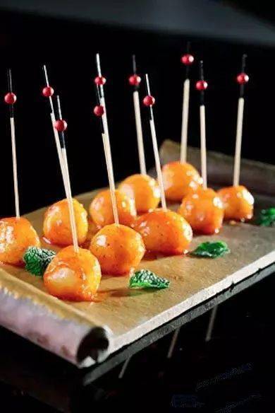 3.锅内放入煳辣油15克,烧至五成热时,先放入姜末、蒜末各3克炒香,然后倒入番茄酱10克炒匀,再放入细辣椒面5克、白糖和盐各3克、白醋10克调味,用湿淀粉10克勾芡,倒入炸好的荔枝鹅肝翻拌均匀,出锅装盘,插上小竹签,撒入炸香的薄荷叶3克点缀即可。
