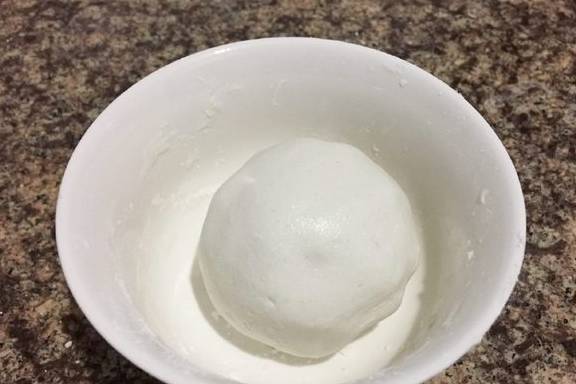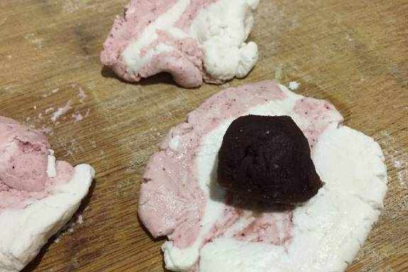 6、按扁,放入红豆沙馅,虎口向上推、收口、搓成汤圆。