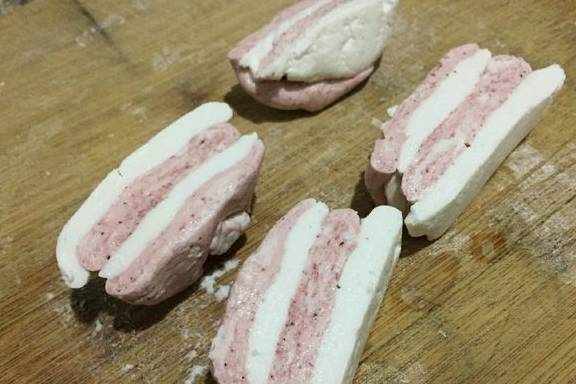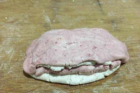 4、把红、白两色分成小团,压成长方形条叠加起来。
