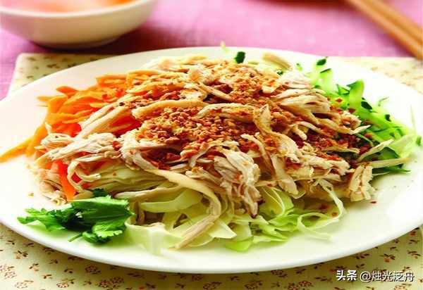 3、鸡肉捞出过冰水冰镇一下,让口味变得脆嫩,随后取出将其撕成条状,备用。