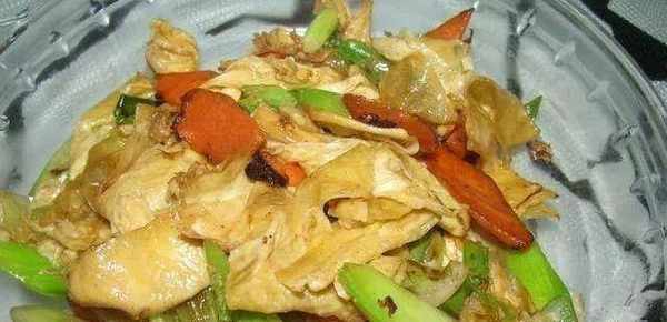 油豆腐、胡萝卜片、葱切块,锅里倒入热油,胡萝卜烧热,稍炒,放入豆皮和葱,再加入调味料,翻炒均匀,茄子烤好,即可食用百吃不厌的经典家常菜
