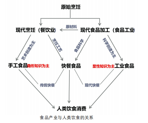 餐饮业、食品工业、快餐业三者之间有着极为密切的关系,不同产业为人们提供不同加工程度和不同性状的食品。无论是哪类食品,其共同特征都是包含原料选取,工具、设施设备使用,技法技术施展3个要素,以此引起、调整和控制人与食品之间的相互关系;其不同特征是表面上食材、加工工具、设施设备和技法技术的差异和本质上创造性(艺术创造、科学创造)、知识的应用(隐性知识、显性知识)差异而形成的不同性状的食品。正由于这种差异才能满足人们不同层次的饮食需求。