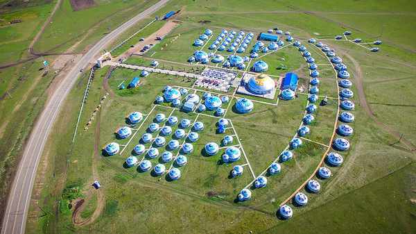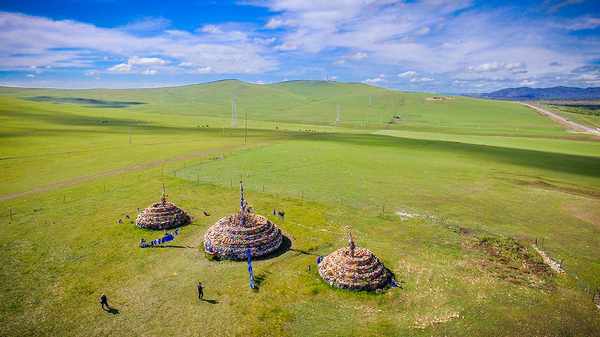 在这些蒙古大营附近的山顶,可以见到蒙古族的敖包,敖包用石头堆成的一座圆锥塔形,顶端插着一根长杆,杆头上系着牲畜毛角(或叉戟),以及围绕着彩色随风舞动的经文风马旗。从高处眺望和航拍附近的河谷,河湾倒映着蓝天碧色,一幅绝色的塞外草原画卷。