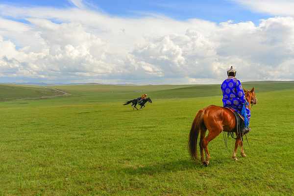 蒙古族大爷穿着传统服饰,远望着路上来往的车辆,一切都是慢悠悠的。蒙古青年穿着美国西部牛仔的服饰,在草原上练习赛马竞速,也许是为了哪次赛马会在做准备。都说蒙古族有“男儿三艺”,摔跤、射箭、赛马,蒙古汉子挑最好的骏马作为自己心爱的坐骑,牧民胯下的骏马是百里挑一,奔跑起来与骑手人马合一,无比的默契,是天生的马背上民族。