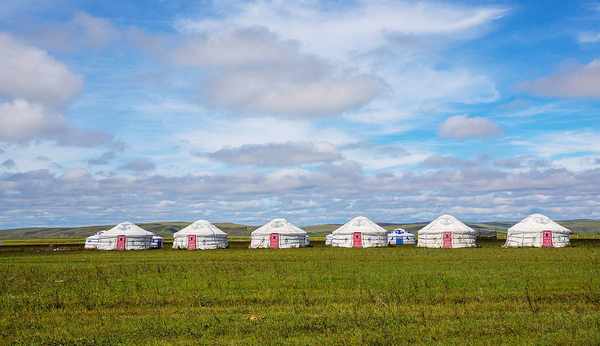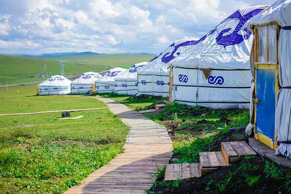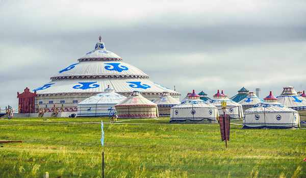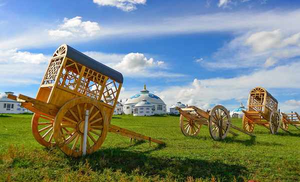 在大营前面平坦的草地上,还停着不少木头的马车,这些蒙古马车和后面的宏大蒙古包形成了一幅美丽画面。游客有兴趣,还可以乘坐马车游览附近的草原,坐马车也成为这里的一项游客体验旅游项目。在这里的草原上,还可以学骑马、玩射箭、牧民家庭共进美食、体验蒙古包住宿等等,原来的很多蒙古族文化内容,都变为了可提供游客的旅游项目。