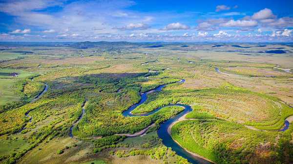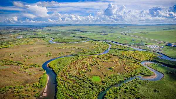 尤其是在额尔古纳河流经的大片草原地区,河滩傍的牧草格外茂盛,这里是呼伦贝尔大草原的美景精华段,人为干扰情况很少,依然保持了自然原始的面貌。在这里,你可以欣赏到独特的千曲河湾风光,感受到大自然的魅力,见识到悠悠河水,绵绵却强大的地形塑形力。额尔古纳河上游河流发源于大兴安岭,汇流了草原上的诸多溪河,流经呼伦贝尔草原,最终注入黑龙江,这条河流围着呼伦贝尔大草原整整绕了一个大圈,成为了草原的母亲河。