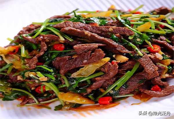 5、锅中留下底油,加青红椒煸炒出味,倒入牛肉,盐,味精炒匀撒上香菜梗炒至熟透即可。