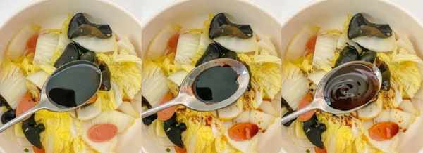 第一步:准备娃娃菜、火腿肠、豆腐和配料,黑菇用热水泡软,用刀把黑菇的根切掉,锅里烧半锅热水,加勺子盐,倒入黑木耳煮几分钟,用清水冲洗干净,沥干水分。