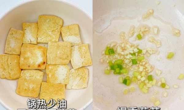 第三步:大蒜剥一层蒜头,蒜剁成细末,香葱洗净切葱花,生姜几片切成细末,火腿肠切片,以上准备一些配料,开始做菜这道宝贝菜火腿烧豆腐。第四步:锅里加入少许橄榄油,放入一些豆腐块,锅底记得多放油,等豆腐慢慢炸至金黄,翻面炸至熟,捞出变硬旁边。