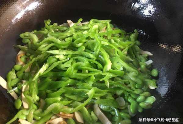 第七步:加入一些毛豆,翻炒。将毛豆炒至酥脆,加入香干条翻炒,让两者一起炒至软烂,撒上少许青椒丝。