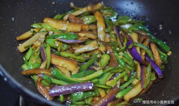 第五步:锅底留少许油,放入五花肉快速翻炒出油,待五花肉变色后,加入蒜头和葱花炒香,加入虾皮翻炒几次。第六步:倒入切碎的青红椒翻炒,倒入茄子块翻炒,让茄子吸收油脂中的油脂,在锅边洒一小碗水。
