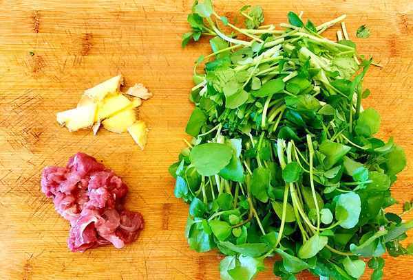 材料选择:准备100克左右的瘦肉,买一把西洋菜(200克左右,西洋菜是南方普遍很常见的一种西洋菜。这种甜菜主要看叶子和根的新鲜度,还有叶子不要发黄,叶子要非常完美,没有枯萎缺水,根茎要挤得很软,买来的西洋菜用保鲜膜包好放冰箱),准备3片生姜,水少许,味道鲜一些,胡椒粉少许,盐一小勺,准备淀粉或生粉,料酒和生抽,猪油少许,小葱少许等。
