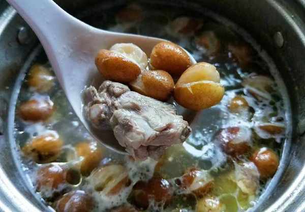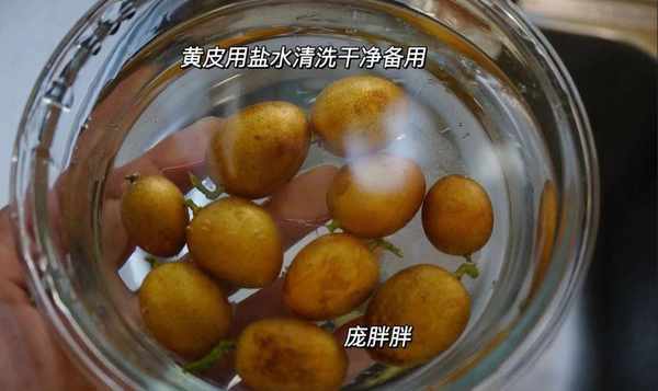第四步:放一些黄皮果(黄皮皮有些脏,需要用盐和水浸泡,反复清洗,去掉黄皮果核)