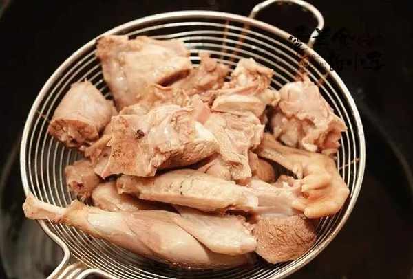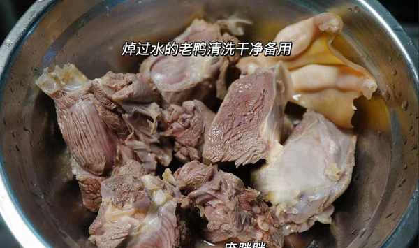 第一步:选用优质黄果老鸭,先将老鸭清洗干净(主要是去除鸭毛和内脏),将老鸭剁成几块,用清水冲洗干净,鸭肉用冷水浸泡,捞出鸭肉的血。